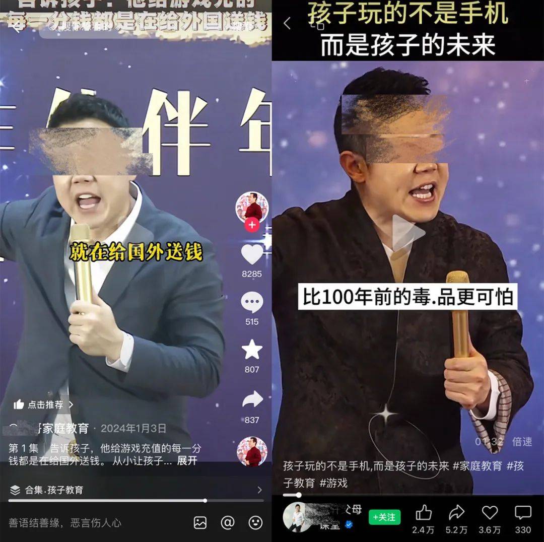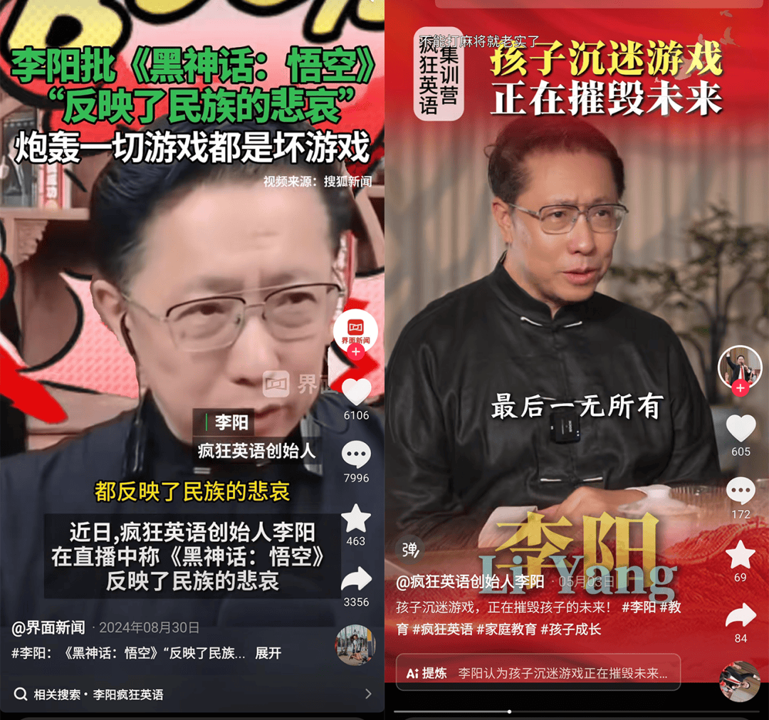 王琨和李阳只是在这批“反游戏导师”里比较知名的,在短视频平台还有无数账号用着同样的话术、同样的镜头语言,歇斯底里地控诉游戏,渴望得到流量的青睐。