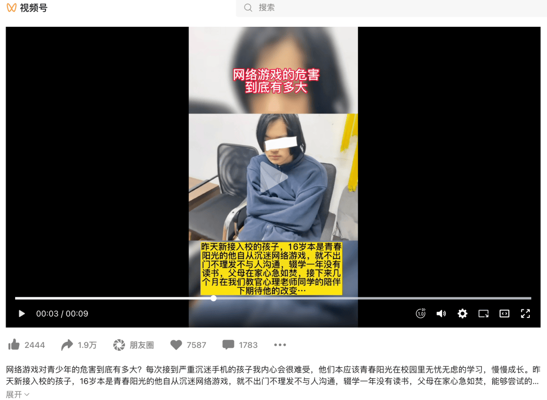 而另一家“青少年特训学校”短视频账号三年前发了一条《网络游戏对青少年的危害到底有多大?》的视频,突然,流量爆了。2400 个点赞、1.9 万转发、7600个红心,接近2000 条的评论。