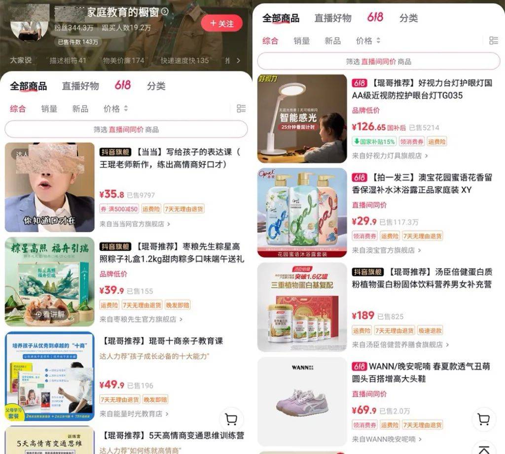 依托巨大的流量,即使销售抖音商品橱窗里的小商品也有不错的收益。从“琨哥说家庭教育”账号的橱窗数据可以看到,已售商品达到143万件,品类包括牛奶、筋膜枪、染发剂、粽子等等,光是各种教育课程就售出了超10511件。