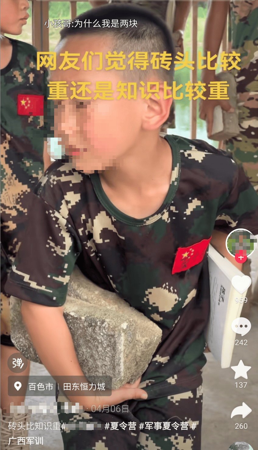 在创世魔训,有一个训练环节,是让孩子们一手拿着两块砖头,另一只手拿着一本书,坚持一节课,目的是“让孩子知道,父母搬砖比读书辛苦多了。”现场,有手发抖,佝偻身子,流出汗与泪水的孩子;也有孩子反绑双手,地面淋满了水,小孩用头不断顶着一个箱子往前走。