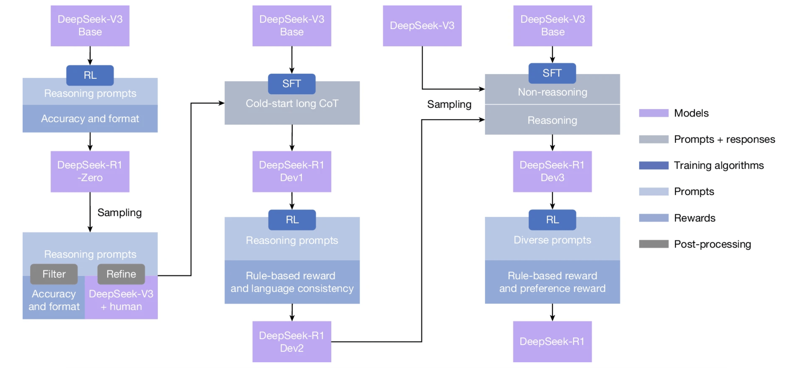 技术实现方面,DeepSeek使用DeepSeek-V3-base作为基础模型,并采用GRPO(Group Relative Policy Optimization)作为强化学习框架来提高模型在任务上的性能表现。
