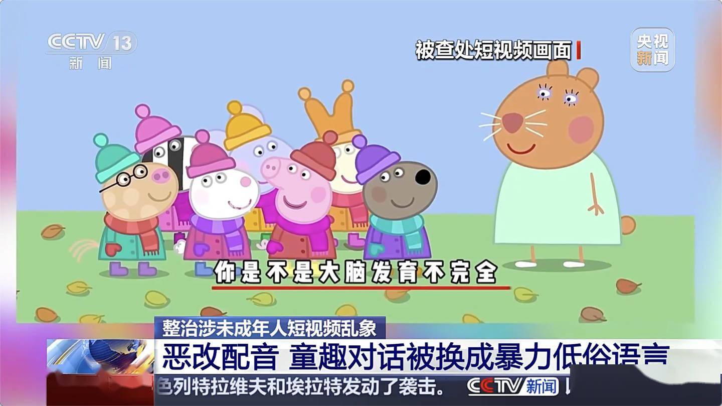 - 《小猪佩奇》等动画片遭恶改,童趣对话被篡改为暴力低俗语言,传播不良信息;
