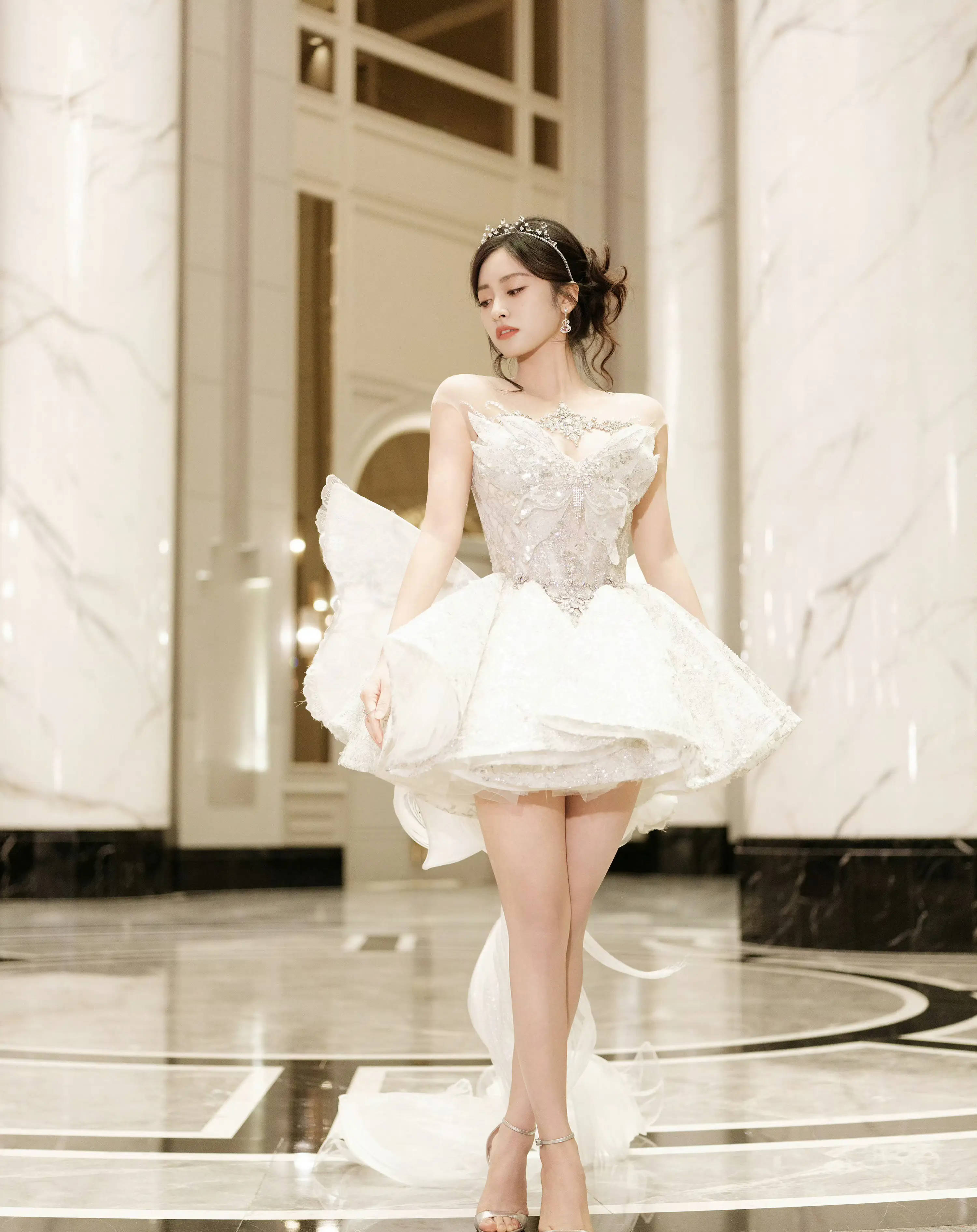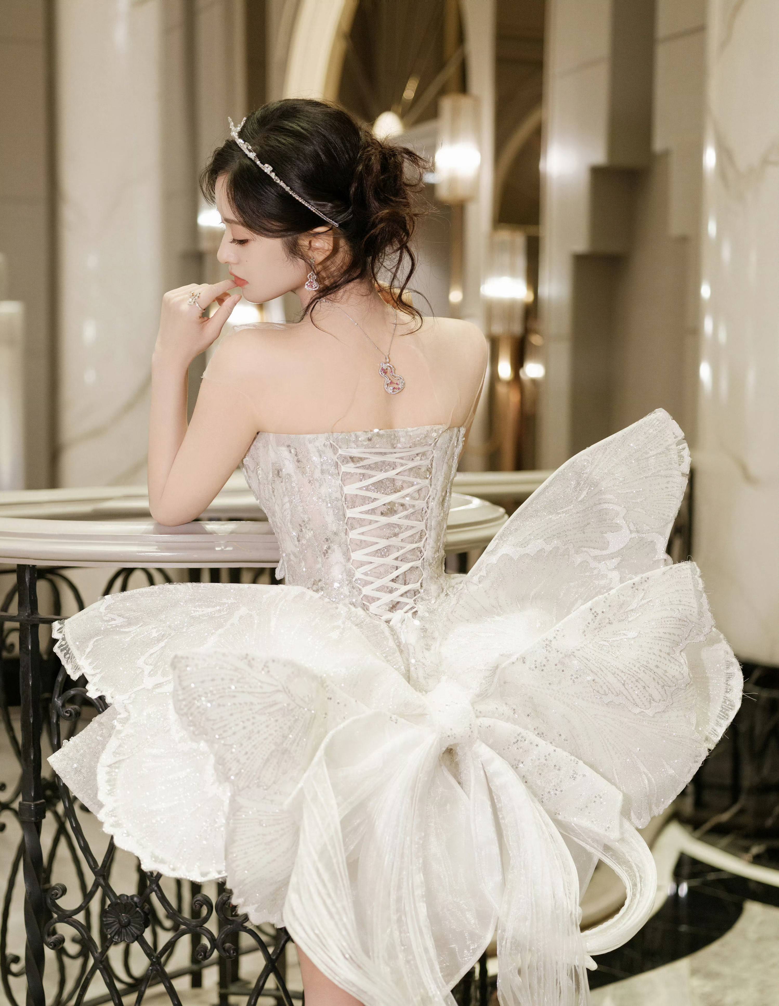 沈月大秀美背,裙摆好像蝴蝶。