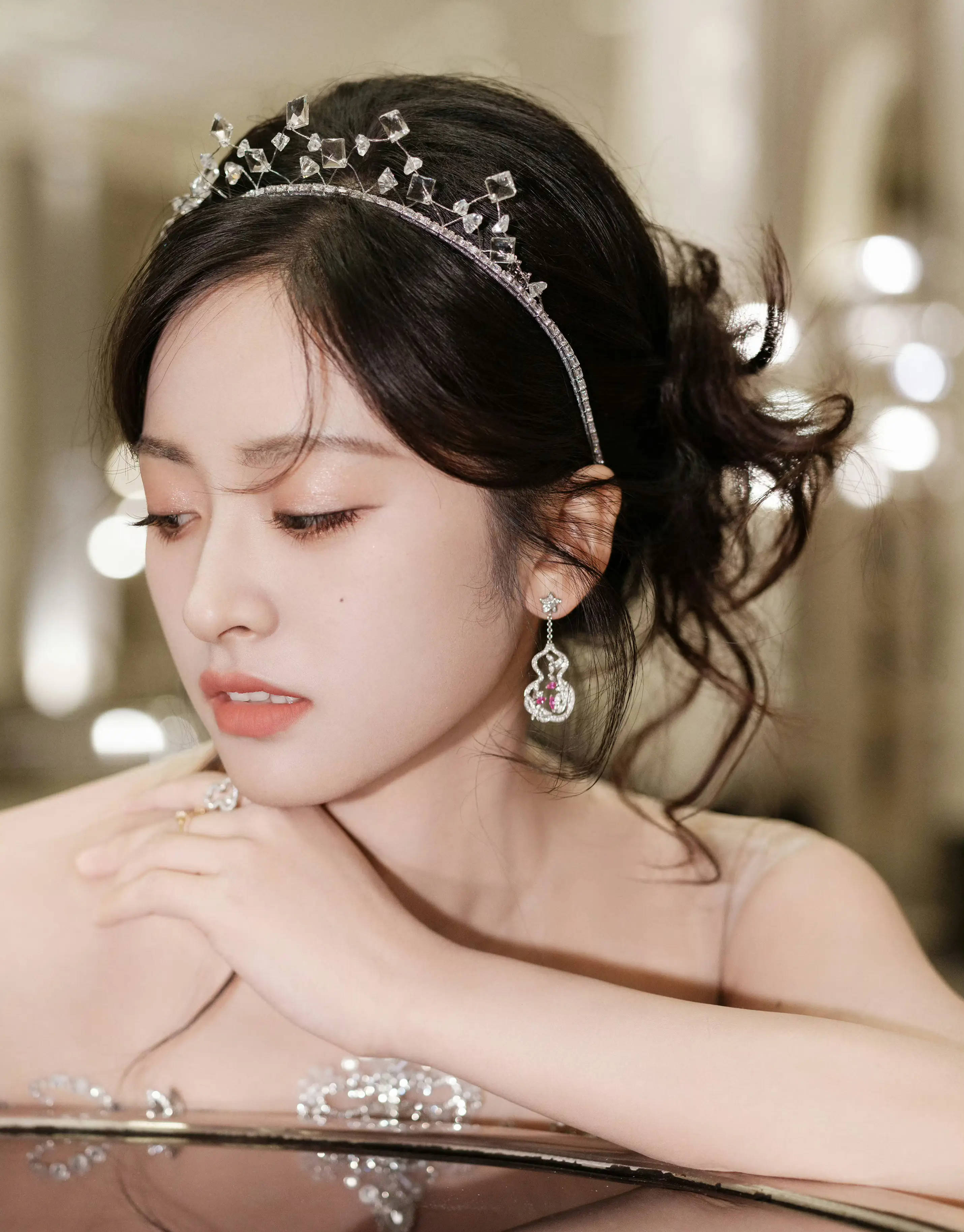 沈月穿抹胸礼服,肩颈线条好优美。