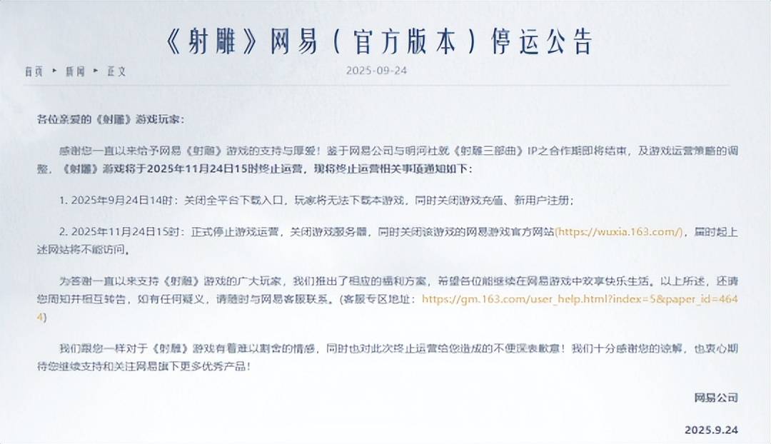 2025年9月24日,《射雕》宣布停运。从公告当天算起,下载、注册和充值功能立刻关闭,11月24日游戏将彻底关服并下线官网。