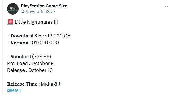近日,据PlayStation Game Size报道,《小小梦魇3》在PS主机上需占用存储空间约16.030 GB。关于游戏预载时间,玩家可自10月8日起提前下载游戏内容,并等到10月10日正式发售开始游玩。