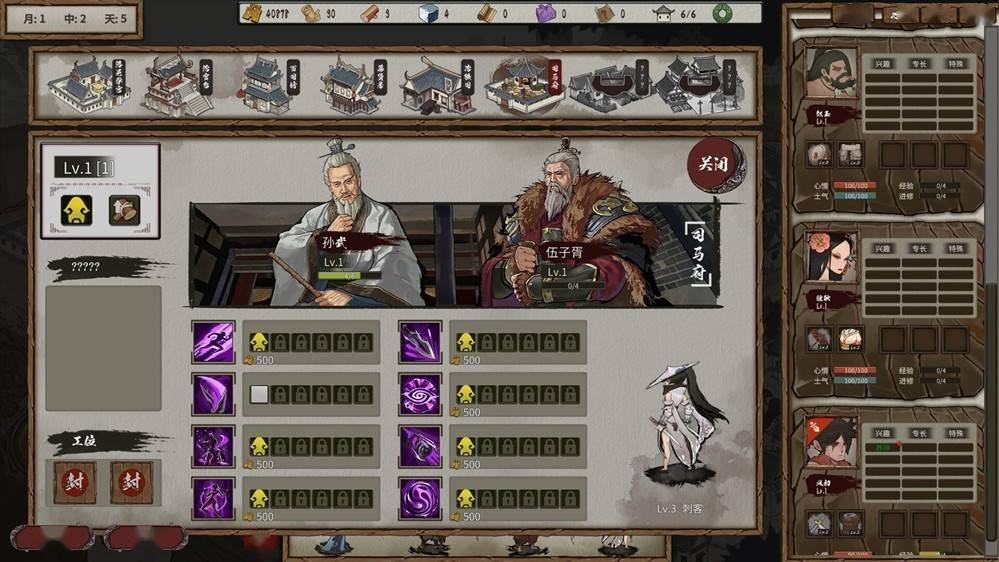 每当探险结束返回城镇,短暂的休憩成为侠客们难得的放松时刻。在这里,你可以兴建各类功能建筑,招引春秋时代的传奇名士前来相投——信陵君魏无忌助你广纳豪杰,神匠干将为你锤炼兵器,谋圣鬼谷子则能提振全队士气。你还可通过祭祀与研究不断提升队伍实力,为未来的征途做好准备。