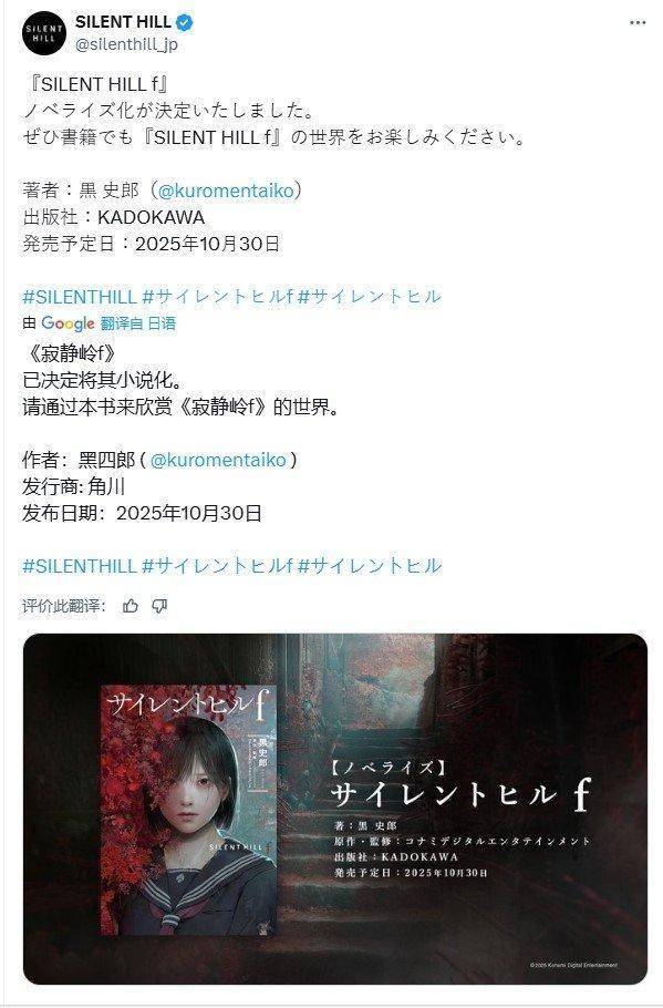 科乐美与角川集团共同宣布,将基于《寂静岭》系列最新作《寂静岭f》改编的官方小说,定于2025年10月30日在日本发行。