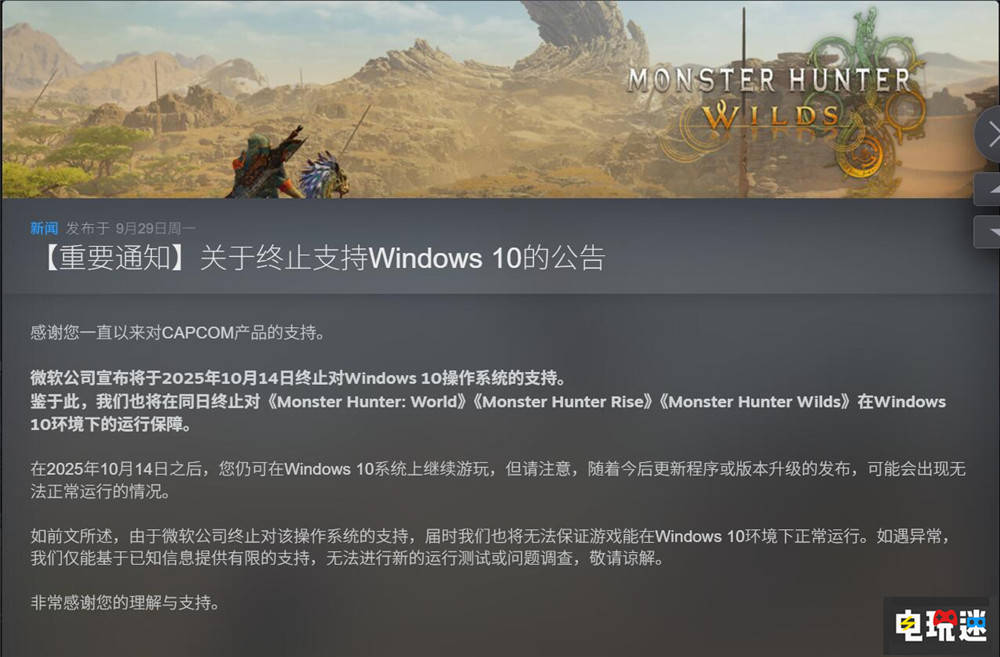 卡普空官方宣布《怪物猎人:世界》、《怪物猎人:崛起》与《怪物猎人:荒野》三款登陆PC的《怪物猎人》游戏都将在微软10月14日终止Windows10操作系统支持的同时终止对Win10系统的游戏运行保障。