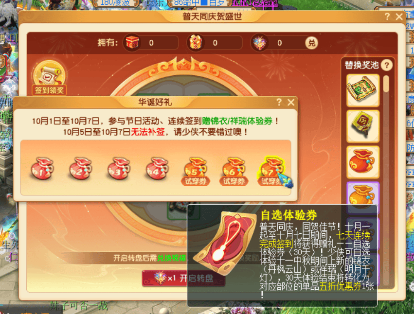 若连续签到7天,可以获得中秋锦衣或祥瑞的30天体验券(自选一张),30天体验券将在体验到期后自动转化为对应部位(锦衣或祥瑞)的单品5折优惠券1张,供大家使用。