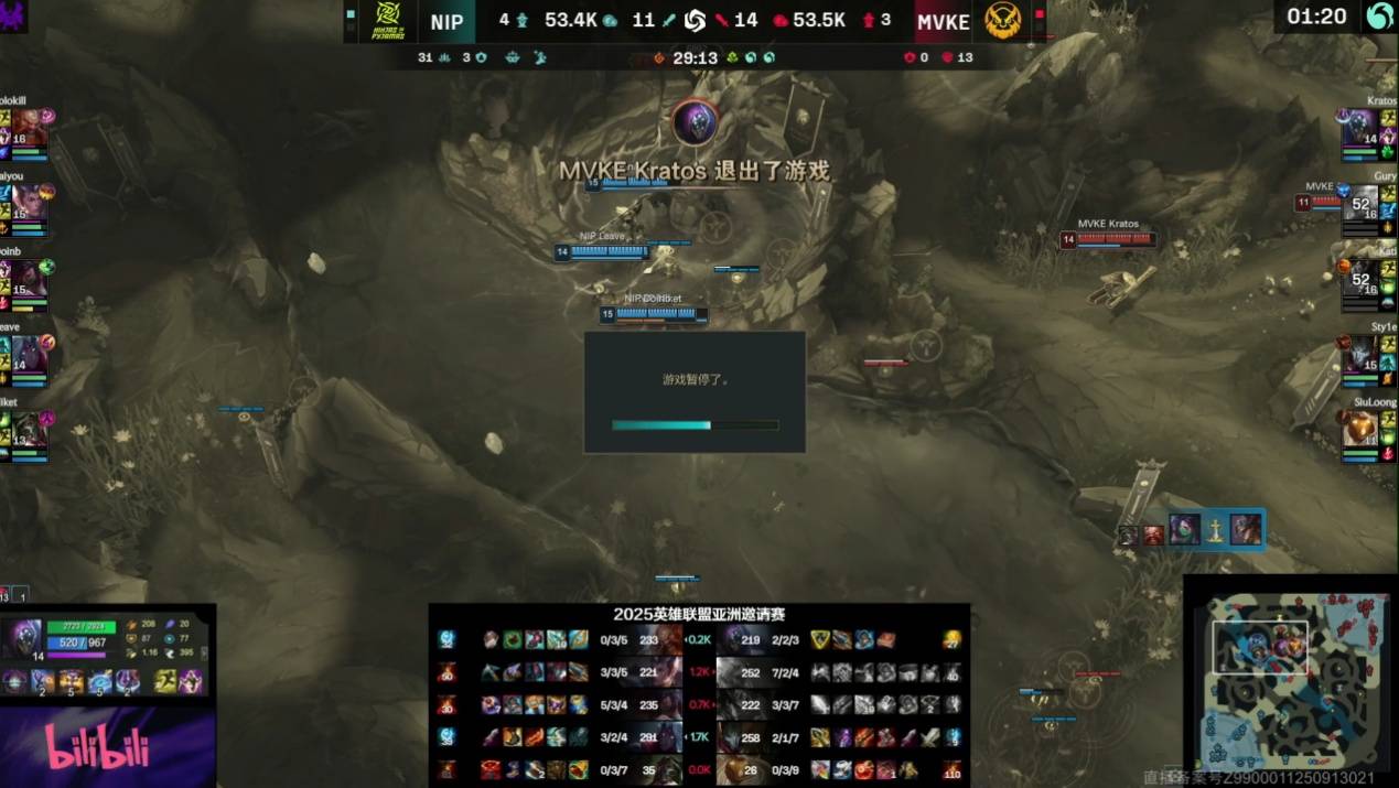 从当时的情况来看,MVKE全员掉线都处于静止状态,狗熊触发了掉线直接回城的机制,但被NIP留住击杀,侧翼的卡牌随后也被斩杀,NIP拿下两个人头后比赛进入暂停,进入裁判环节。
