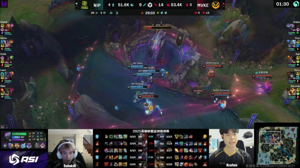 当时NIP的经济是落后的,选择五人强势Rush大龙,MVKE前来防守,狗熊一马当先,配合远程的巴德大招与烬大招尝试阻止NIP打大龙并且开启团战,但在狗熊接近NIP的时候,MVKE突然全员掉线,这波掉线也直接影响了比赛进程,NIP最终也得以侥幸取胜。