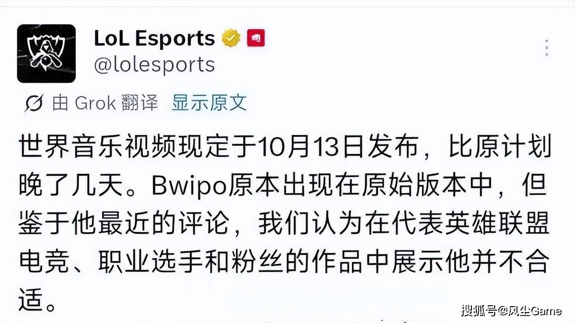 今年的全球总决赛,是真有点拖沓,往年这个时候,比赛早就开始了,今年连主题曲、MV,都还没有上线,原本主题曲上线时间,是定在10号左右的,但拳头近日突然宣布延期,原因是:FLY战队上单Bwipo选手,不适合出镜,所以官方需要对MV进行修改,北美赛区今年没有视频片段。