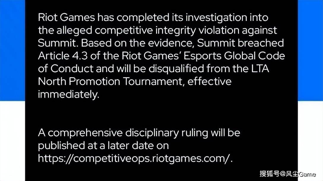 TheShy高中同学Summit,最近在征战LCS赛区升降赛,在交手DSG的比赛里,因为遭到网络攻击,比赛一度暂停超过5个小时,期间Summit选手,打开官方比赛直播间,被观众当场逮捕,官方以作弊为由对其禁赛调查,在调查了一天之后,LCS官方发文宣布:取消Summit的参赛资格。