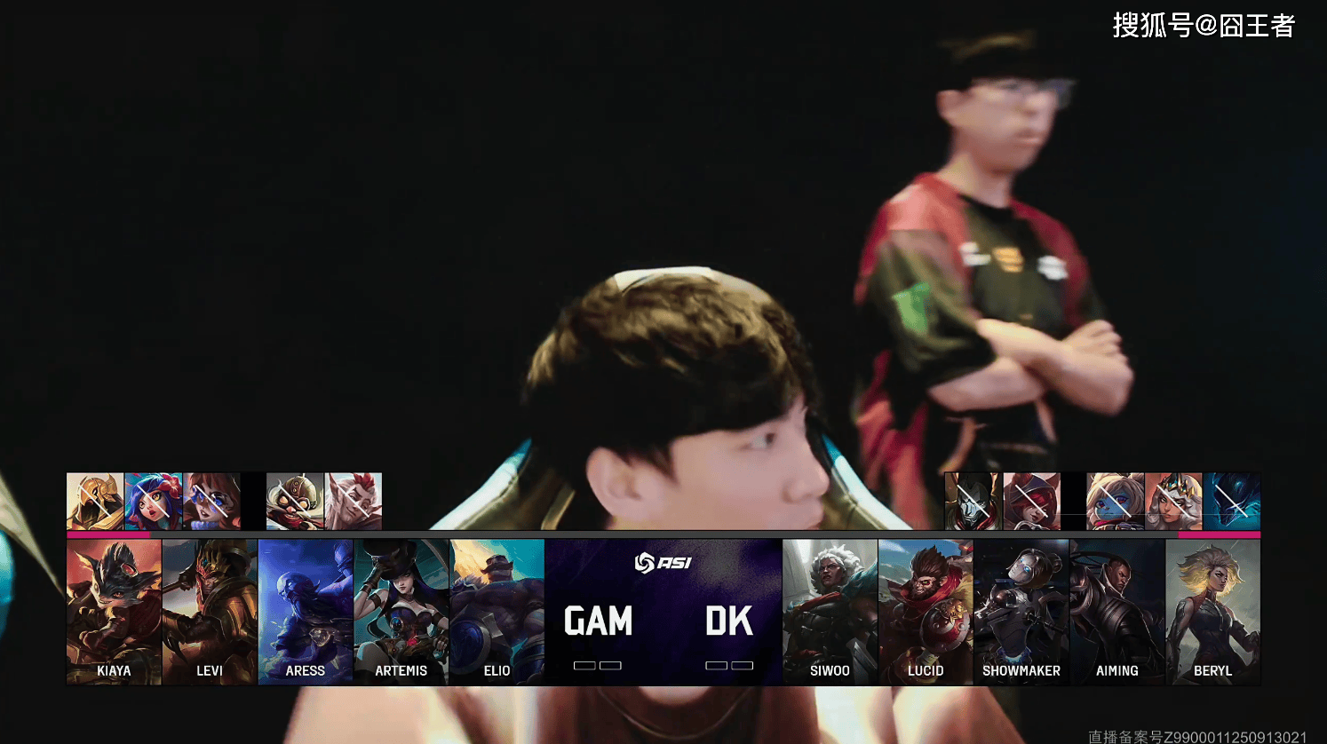 第一局比赛,GAM蓝色方,禁用:沙皇;妮蔻;阿萝拉;飞机;洛,选用:Kiaya兰博;Levi皇子;Aress瑞兹;Artemis女警;Elio布隆;DK红色方,禁用:梦魇;奇亚娜;波比;霞;烬,选用:Siwoo狼母;Lucid猴子;ShowMaker发条;Aiming卢锡安;BeryL芮尔