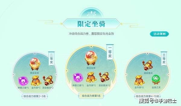 第1名:限定坐骑+神兽之魂*5+金币袋*5+高级兽诀*3