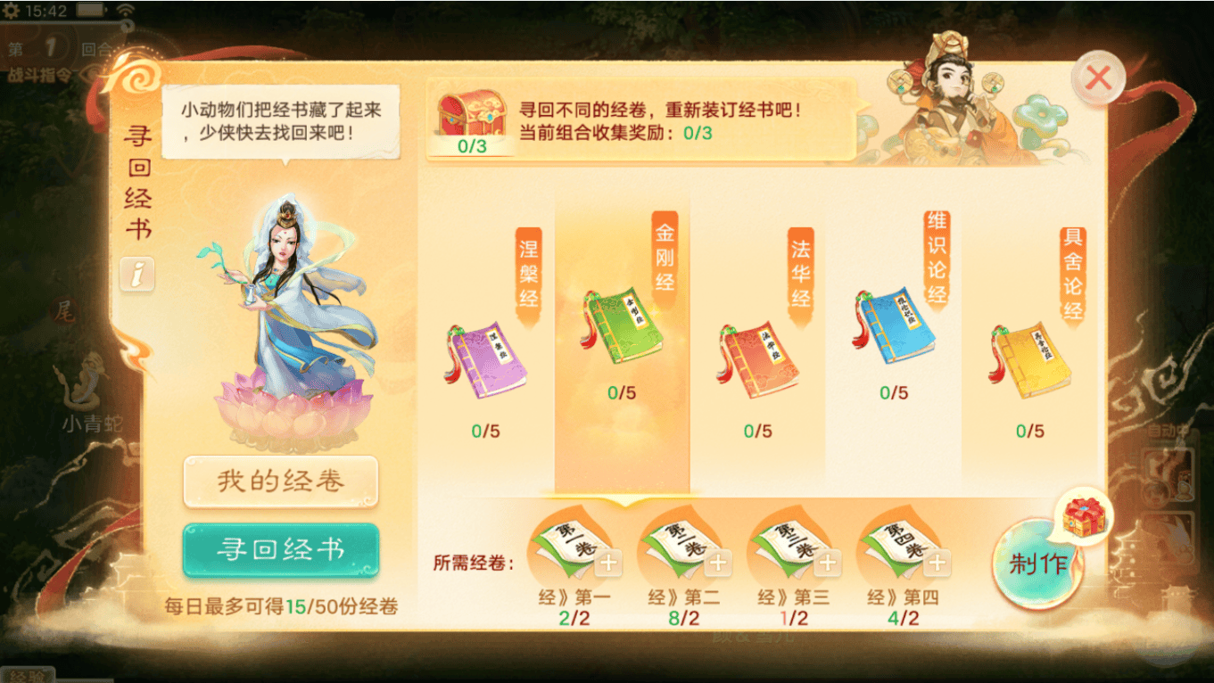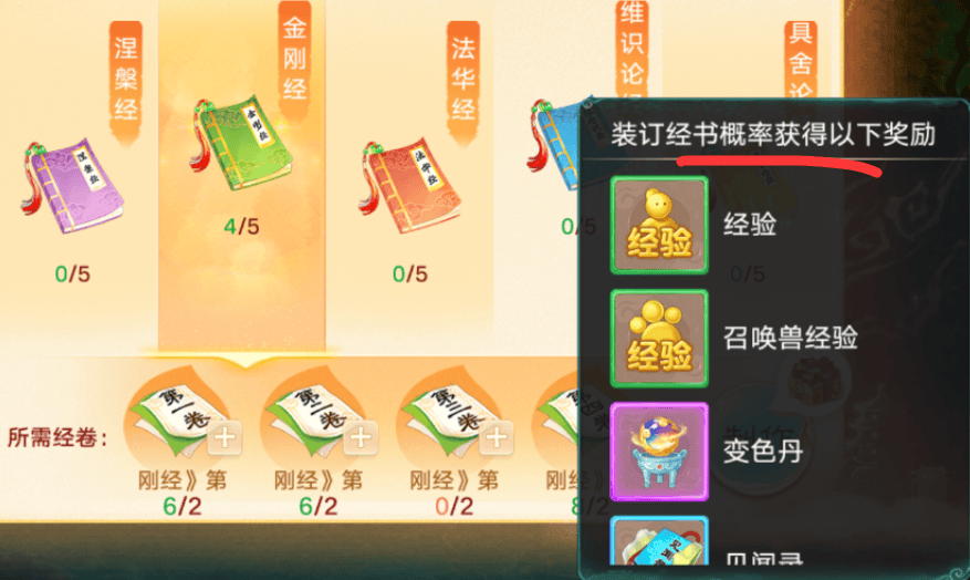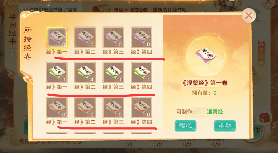 可以看到,寻回经书活动,一共有《涅槃经》、《金刚经》、《法华经》、《维识论经》、《具舍论经》五部经书,每一部经书有四卷。想要装订成册,就必须找齐每一部经书的四卷,每一卷需要2个。