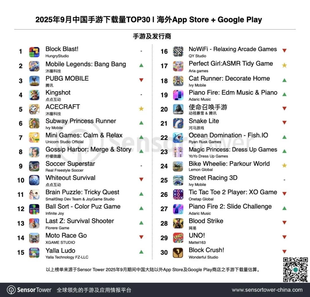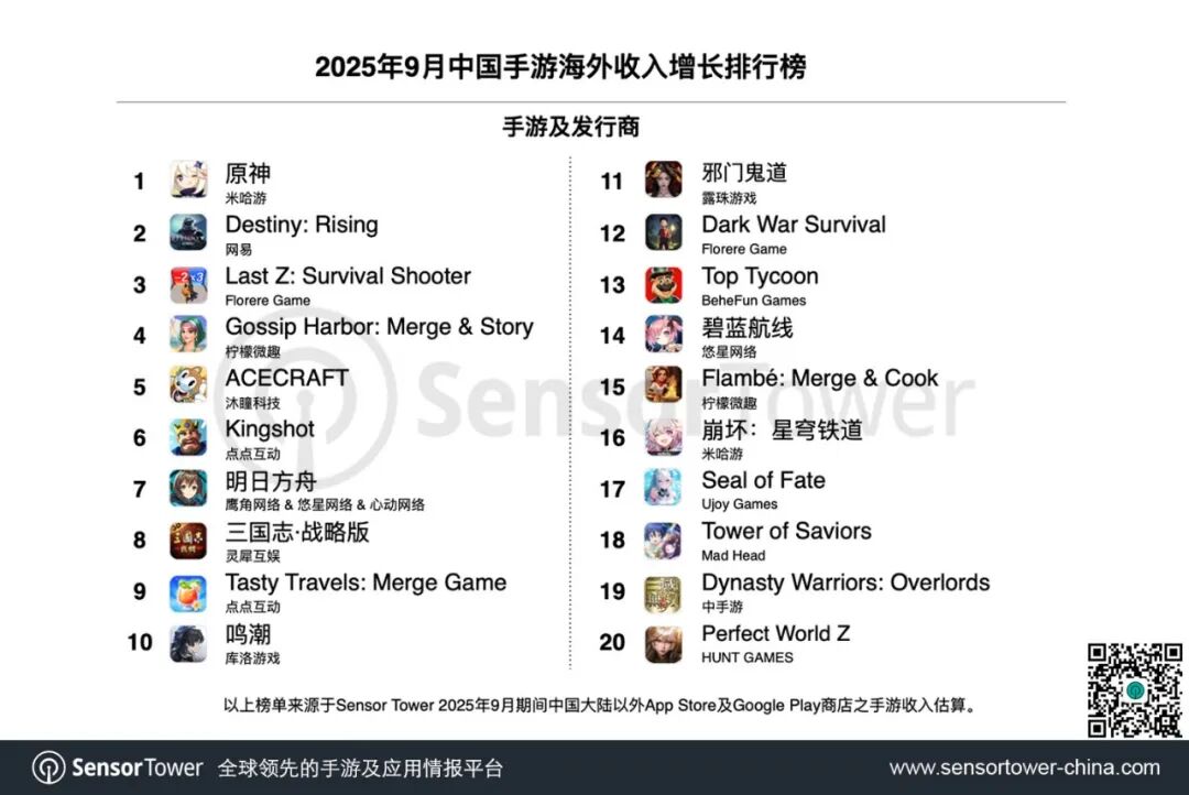 10月11日,Sensor Tower公布了9月中国手游在海外市场收入及下载量排行榜,详细榜单变化如下。