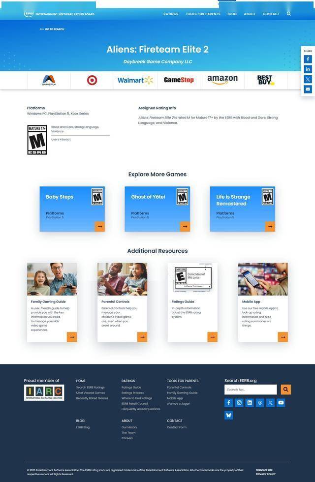 外媒Gematsu在社交媒体上分享了《异形:火力小队2》的ESRB分级截图,目前该分级已经从ESRB官网撤下。截图显示,《异形:火力小队2》获得ESRB M级(Mature)分级(这也是大多数3A游戏获得的分级),原因是续作含有大量的暴力画面,脏话,喷血和残忍画面,听起来很符合一个《异形》游戏该有的样子。
