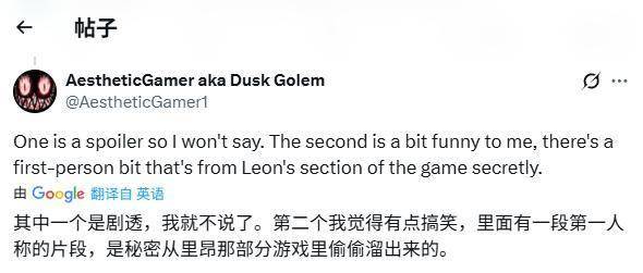 Dusk Golem称,尽管玩家尚未在公开宣传中看到里昂,但他其实在游戏首支预告片中已有两处客串镜头。其中一处涉及剧情剧透未被透露,另一处为第一人称视角画面,据称来自里昂在游戏中的章节。