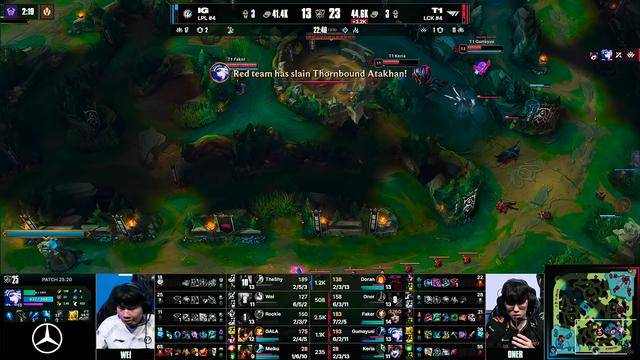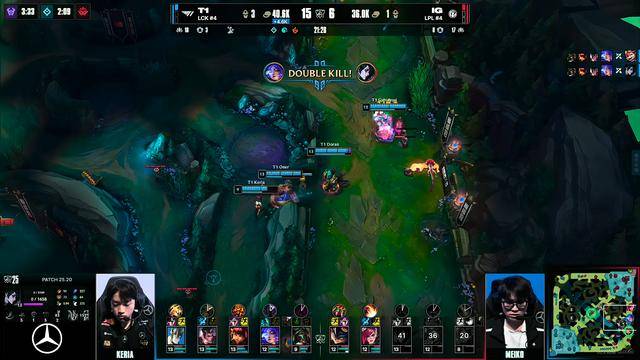 中期IG彻底崩盘,17分钟下路抓人过于贪了,被T1接连将四人击杀,随后Oner野区关灯抓人乘胜追击,IG彻底溃败。整个中期全是T1的抓人节奏。IG虽然在21分钟厄塔汗止住一波节奏,但奈何T1的开团抓机会太过强大,最终还是被T1给拿下厄塔汗。随着比赛的进行,IG进入了“垃圾时间”,T1不断的运营推进,将比赛的胜利更加的握住全部,最终T1在27分钟赢下比赛。
