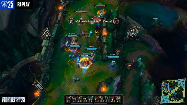 前期Rookie塞拉斯对线极其难受,虽然Meiko帮助一波拿下Faker妖姬一血,但随后Rookie还是被T1给GANK抓死。IG抱团在上路越塔击杀多兰奥恩,但也是1换1。13分钟IG中下两路开花,TheShy打出对位单杀,中路也将Oner梦魇抓死。