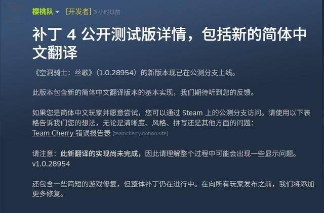 今日(10月16日),樱桃组为《空洞骑士:丝之歌》发布了四号补丁的详细内容并同步上线Steam的公开测试版本,其中重要的一项更新便是上线了简体中文翻译的改进版本。