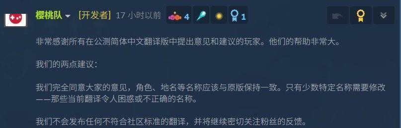 因此,樱桃组关于4号补丁新版的翻译问题做出了回应,表示会持续关注社区玩家们的反馈,并承诺不会发布不达标的翻译版本。