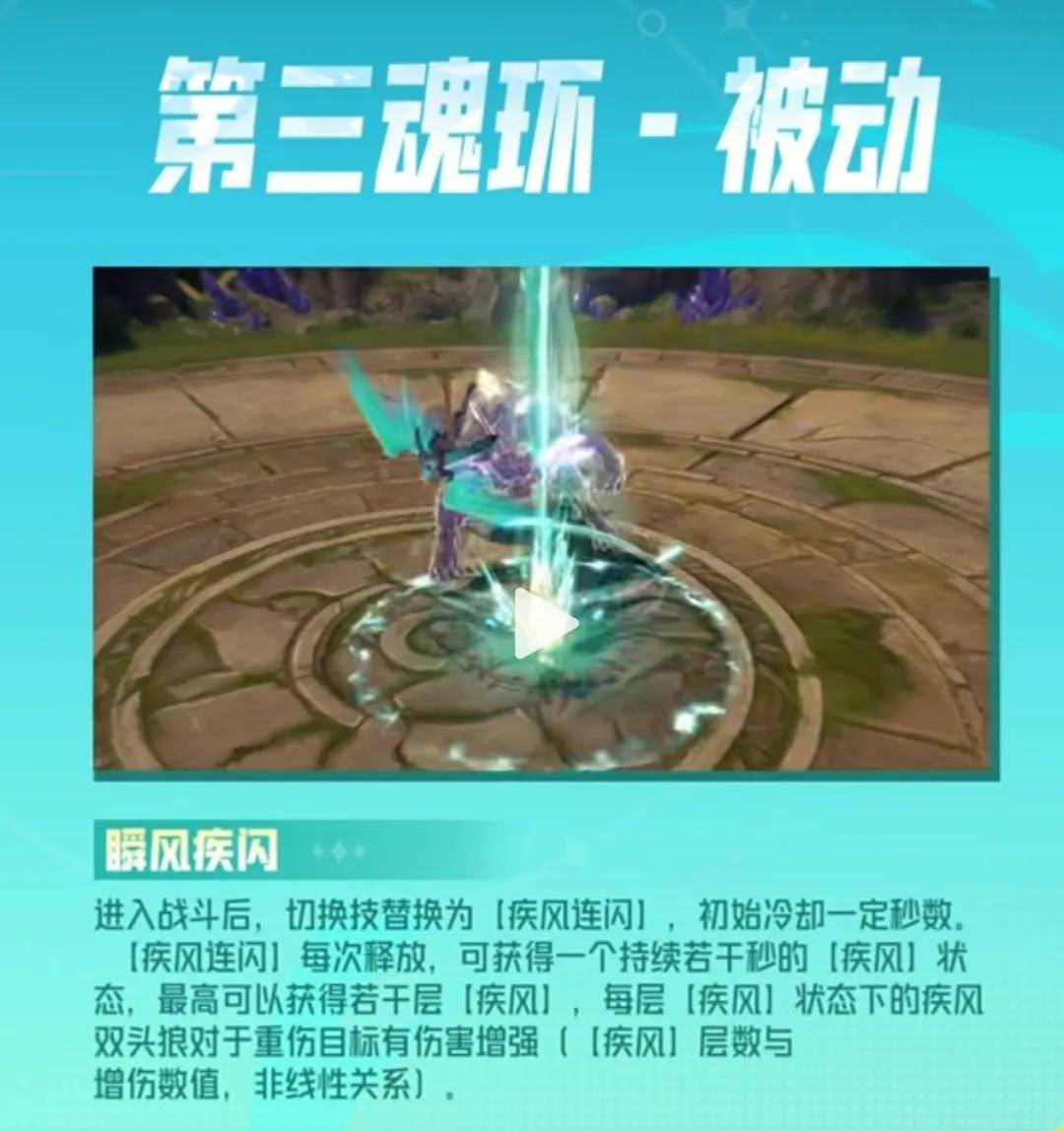 然后3被动就有点意思了,可以看作是风笑天的一个核心机制,其可以直接把风笑天的先机技能给替换为疾风连闪,看这个描述的意思是通过不断释放这个先机技能风笑天便可以积累“疾风”状态,此状态层数越高则起对于“重伤”敌人的输出也就会越高,当然这里还有一个理解就是可以给重伤敌人进行增伤?