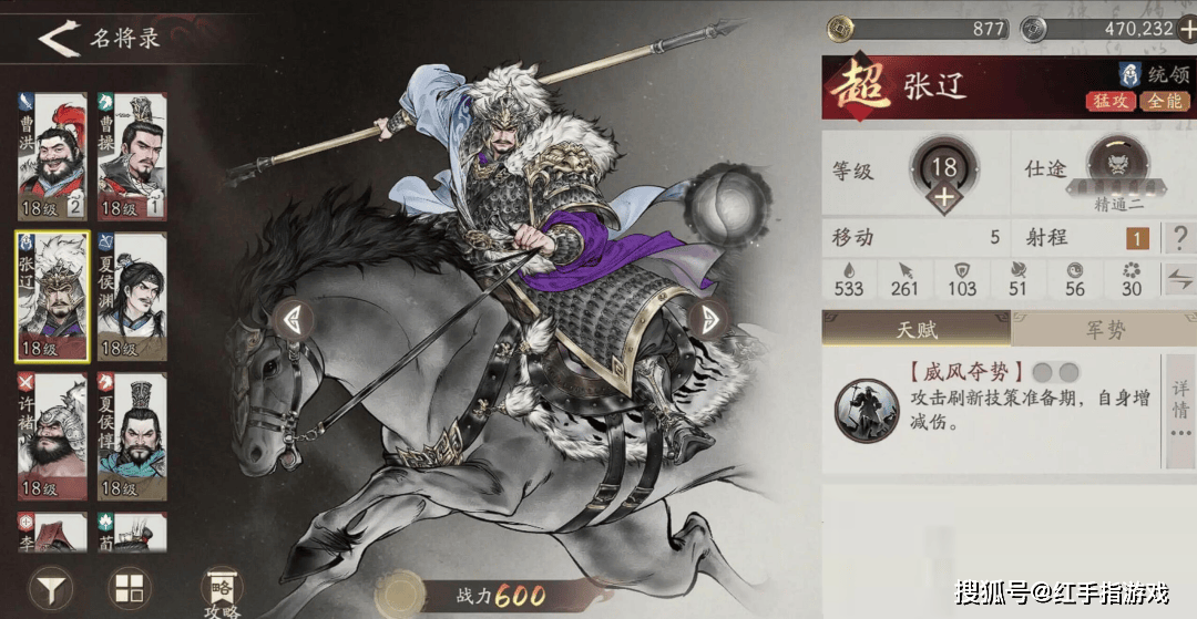 2、张辽——统帅,主打克制反击流队伍,适配骑兵阵容,提升团队输出,上手难度较高,注意依靠操作打出不俗的伤害,并且还能保证身边队友的生存和输出。
