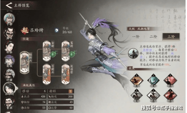 吕玲绮可以简单理解为近战的夏侯渊,同样依靠移动距离来增加伤害。此外移动十二次后还能攻击两次,并且对移动力低的敌人还有伤害加成,强度可见一斑。