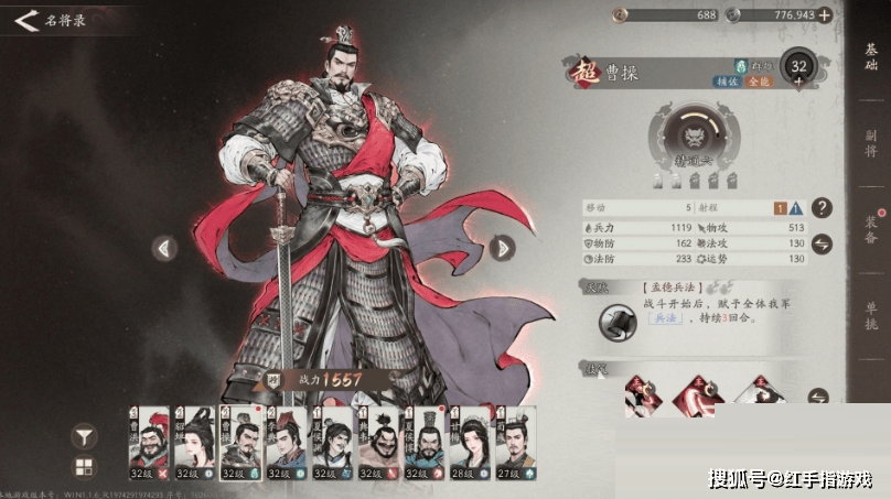 满级属性:移动:5;射程:-;兵力:1119;物攻:513;物防:162;法攻:130;法防:233;运势:130;战力:1557