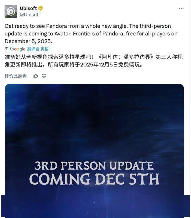 《阿凡达:潘多拉边境》计划在12月5日上线“新游戏+模式”(New Game+)和“第三人称模式”,今天育碧发布了该作的第三人称更新宣传片。