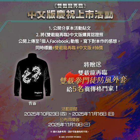 为庆祝《双截龙再临》中文版上市,从今天起举办抽奖活动。公开上传繁体中文版购买认证照或是游玩游戏的画面并留下关于本作的感想,就有机会得到「双截龙再临-双截拳门徒防风外套」。抽奖活动详情如下。