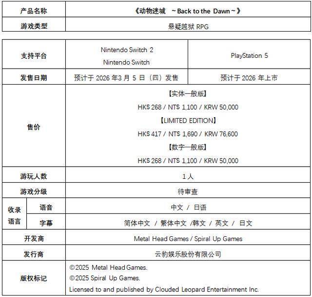 云豹娱乐股份有限公司(总公司:东京都品川区。董事长兼社长:陈 云云)今日宣布,由Metal Head Games开发的悬疑越狱RPG《动物迷城~Back to the Dawn~》的Nintendo Switch™2版以及NintendoSwitch™版游戏,将于2026年3月5日(四)全球同步发行。