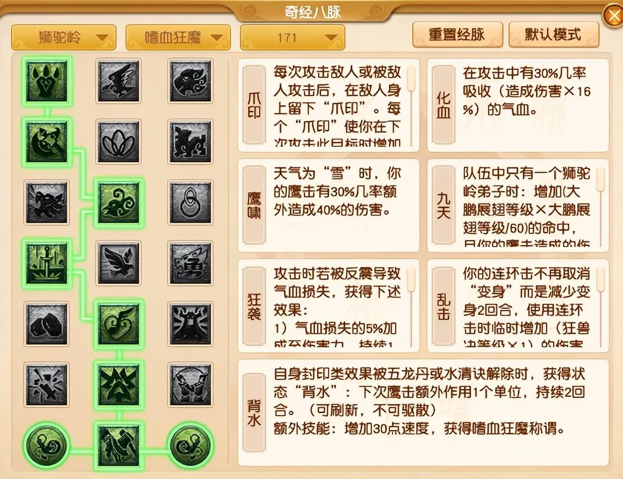 狮驼岭在本次门派调整中并没有太大的变化。因此,依然推荐大家使用【嗜血狂魔】流派刷任务,经脉推荐采用“1121222”的点法。这样的点法不仅通过【化血】经脉获得吸血能力,还可以靠着【鹰啸】、【九天】、【狂袭】获得一定的伤害加成和较为稳定的输出,任务性价比非常高。