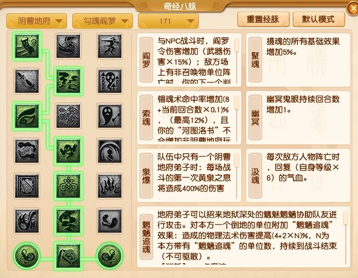 不过,主玩力地府的小伙伴也可以采用【六道魍魉】流派,经脉点法为“3333212”。这么点既可以提升夜间造成的伤害,还能起到降低武器耐久消耗的作用。