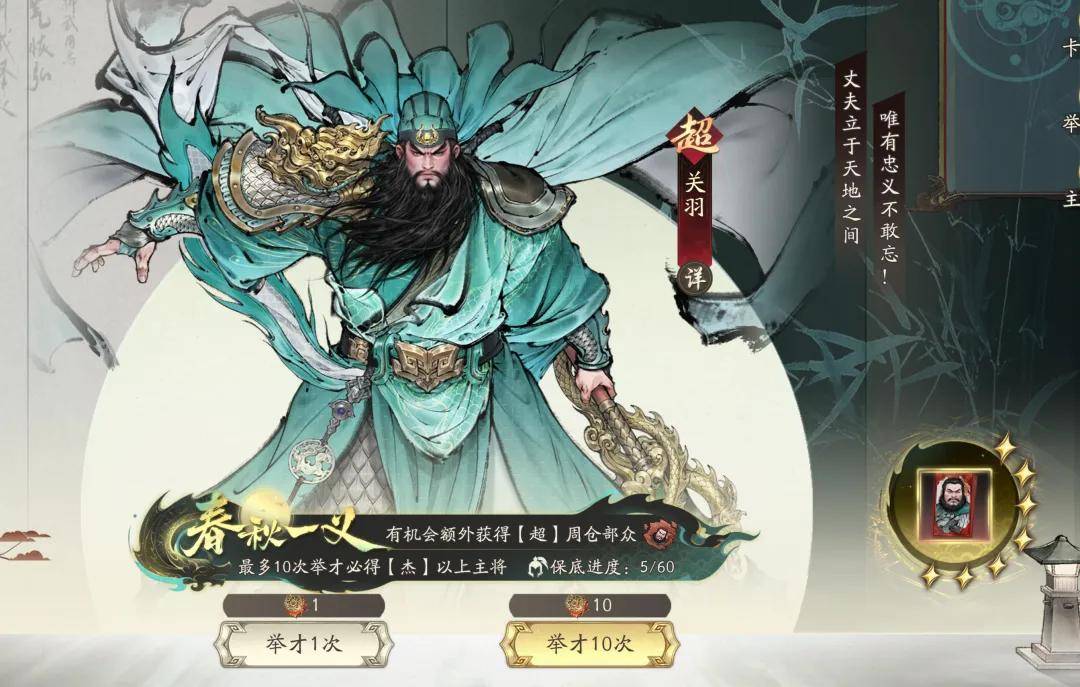 那针对这个池子维一个人建议大家还是可以抽一抽的,毕竟开服后的资源相对会稍多一些,能抽到关羽的话还是对我们的开荒有不小的帮助,但普通玩家最多就抽到一个关羽即可收手,没有必要硬拿200抽的周仓,因为后续还有一个限定池子张飞,其强度和关羽类似也可以达到T0,所以大家需要为张飞也提前预留一些资源。