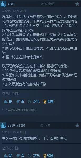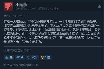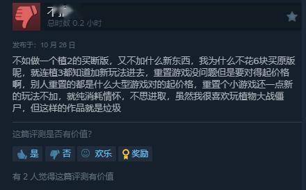 截至目前,《植物大战僵尸:重植版》Steam国区好评率仅为32%多半差评。许多玩家吐槽游戏的bug实在太多,已经影响到正常游戏;细节也缺失太多,手感太差,中文字体难看,音效也进行了阉割,总体而言根本不值98元的定价。