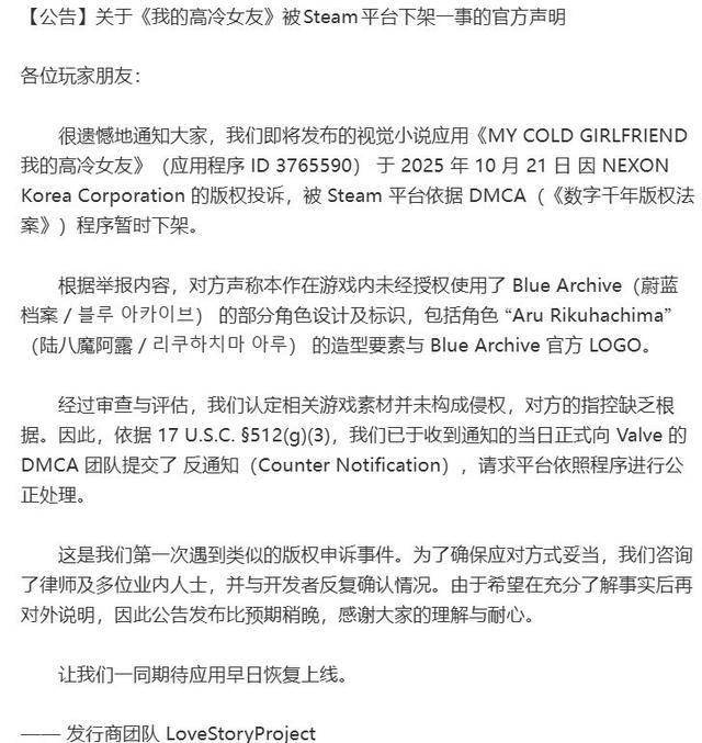 近日,由国产游戏厂商LoveStoryProject发布公告称即将发布的视觉小说《MY COLD GIRLFRIEND 我的高冷女友》于2025年10月21日被Steam依据《数字千年版权法案》下架。