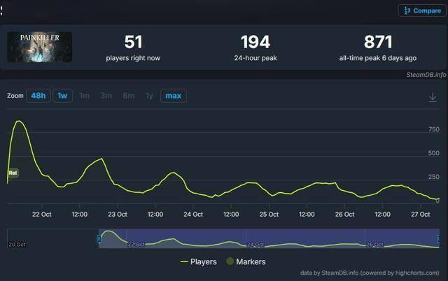 近日《止痛药》新作发售,该作在Steam上没有任何热度。据SteamDB数据显示,游戏同时在线玩家峰值仅为871人。