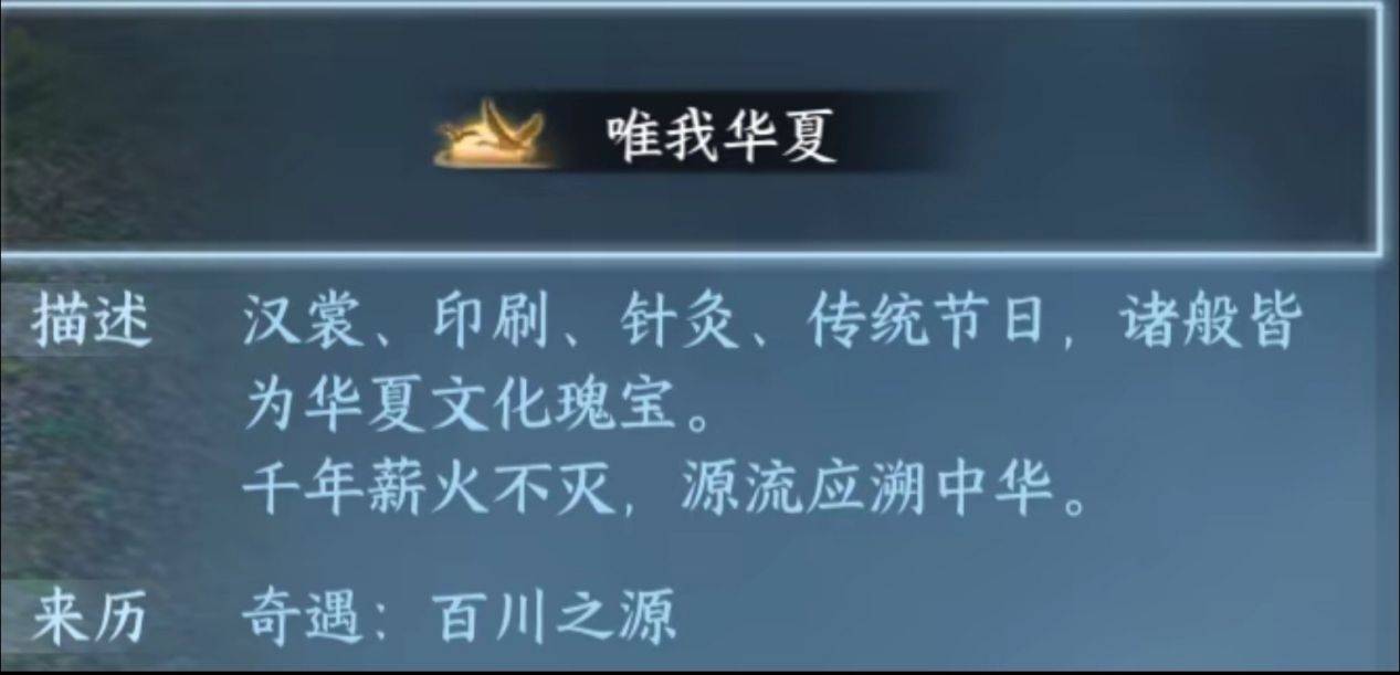游戏中的一些特定奇遇也很好地传播了中国文化,比如奇遇“百川之源”就简单介绍了我国的文化瑰宝,完成后还能获得“唯我华夏”的称号。以后老外在做奇遇任务的时候也能了解到我们的传统文化,这怎么不算是一种文化传输呢?