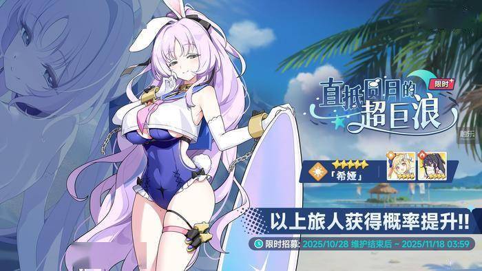 活动期间,旅人招募卡池“直抵圆月的超巨浪”于10月28日限时开启,全新5星旅人“希娅”获得限时招募概率提升。希娅热爱与大海相关的一切,尤其喜欢冲浪,享受海洋的辽阔与自由。身为绒绒族的兔子少女,她还拥有异常敏锐的嗅觉,能通过气味感知他人情绪与性格,而面对重要的人,她会用肢体接触表达好感。在战斗中,希娅作为先锋定位的光属性角色,通过操纵神器浮游炮“雪兔&夜兔”,展现迷人的战斗风姿。