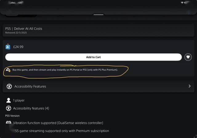 在PlayStation Portal官方Reddit板块上,一位用户分享了一张来自PS应用程序的截图,内容显示《Deliver at All Costs》的商品页面似乎确认:未来PS Plus Premium订阅用户将能在PlayStation Portal上通过云串流游玩已购买的数字版游戏(即无需下载,通过PS Portal云端直玩)。该用户还表示,在《死亡空间:重制版》商店页面也曾出现相同说明,不过相关内容现已被移除。