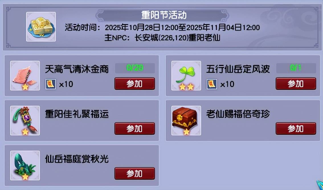 本次重阳节活动时间为2025年10月28日12点—11月4日12点,活动共分为五种任务。其中,天高气清沐金商为环任务,五行仙岳定风波为小副本任务,重阳佳礼聚福运、老仙赐福倍奇珍为特色玩法,仙岳福庭赏秋光为挂机任务。