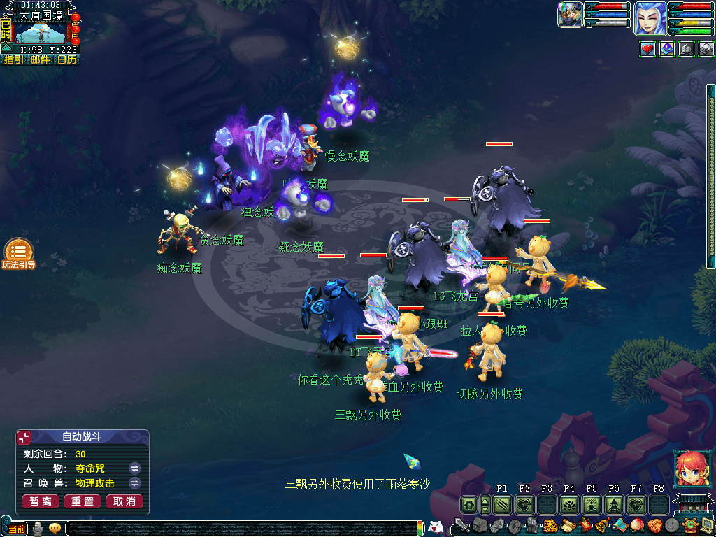 第三场战斗为浊念妖王,主怪门派为魔王寨,偷袭的情况战斗难度较低。如果正面遇上,则建议法防较低的小伙伴通过及时接起罗汉的方式降低战斗难度。