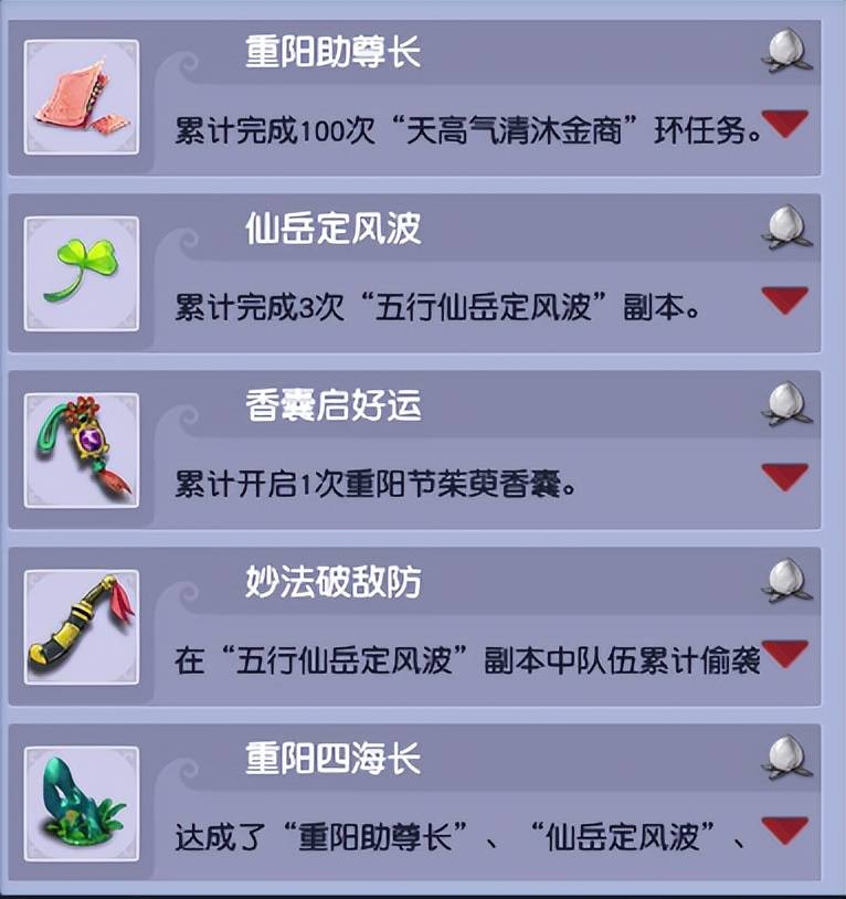 本次重阳节活动共有1点成就。其中,累计完成100次环任务、3次小副本任务、开启1次茱萸香囊、累计在小副本中达成10次偷袭即可获得1点成就。