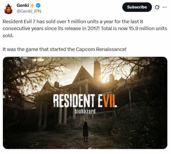 近日,卡普空在最新的财报中更新了旗下主要作品的销量成绩。据国外推主@Genki_JPN消息,自2017年发布以来,《生化危机7》已连续8年年销量超过100万份,目前总销量已达到1590万份。