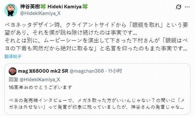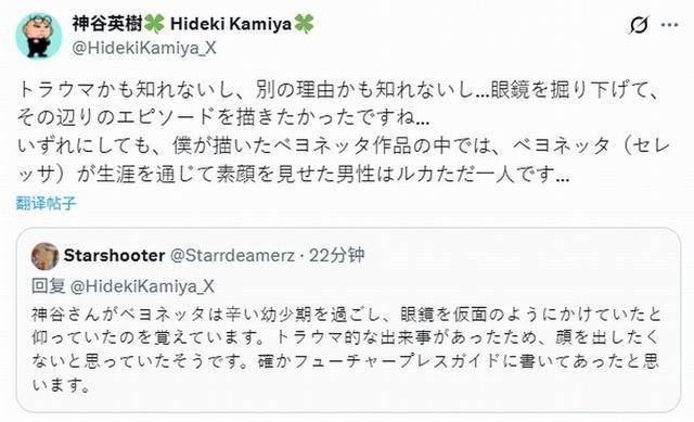 之后又有玩家提问:“我记得神谷先生曾提到,贝姐经历了痛苦的童年,因此她把眼镜当作面具来佩戴。由于曾遭受创伤性的事件,她不愿轻易展示自己的面容。这段内容我记得好像写在《Future Press》攻略书里。”