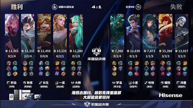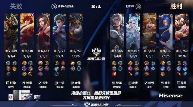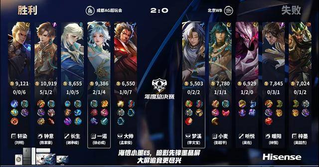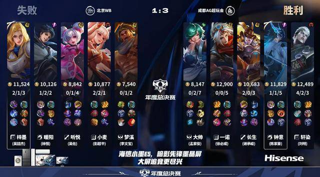 下半场开始,轩染的司空震开始发力。开局被抓的情况下发育依然很好。在庄周大招的掩护下进场疯狂肘,先击杀小乔,再配合一诺击杀暖阳。梓墨的夏洛特也走不掉,被女娲拿下击杀,AG又是一波团把WB打崩了。最后AG推水晶的时候,WB五个人甚至没人处理兵线,都在打人。五人健在的情况下,WB就这样眼睁睁看着AG推掉了水晶。